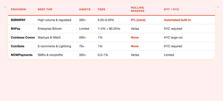 • B2BINPAY differentiates through 350+ supported assets, zero rolling reserve, automatic deposit address generation, and off-chain transactions that reduce fees for high-volume operations.