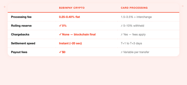 B2BINPAY charges a flat 0.25–0.40% processing fee with no hidden spreads, 0% rolling reserve, and zero fees on outgoing merchant payouts. That compares favourably to card processing, which typically runs 1.5–3.5% plus chargeback exposure.