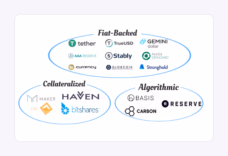 Stablecoin issuers take different approaches to making stablecoins. They use collateralised assets, including fiat money, cryptocurrencies, and commodities, to keep the tokens value. Non-collateralised mechanics include algorithmic stablecoins, which use smart contracts and blockchain oracles, which maintain the value by burning and minting tokens according to market price and demand and supply forces.