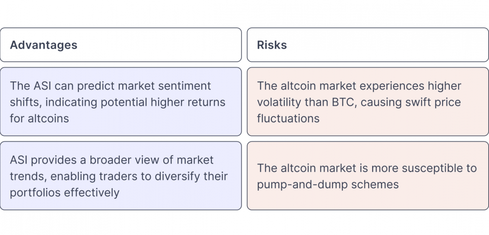 By tracking the ASI, investors can identify an imminent altcoin rise and increase their exposure to altcoins. If timed well, this strategy can bring considerable profits. The ASI is a key indicator of the state of the crypto market, so you can closely watch it to identify an imminent altcoin boom to capitalize on.