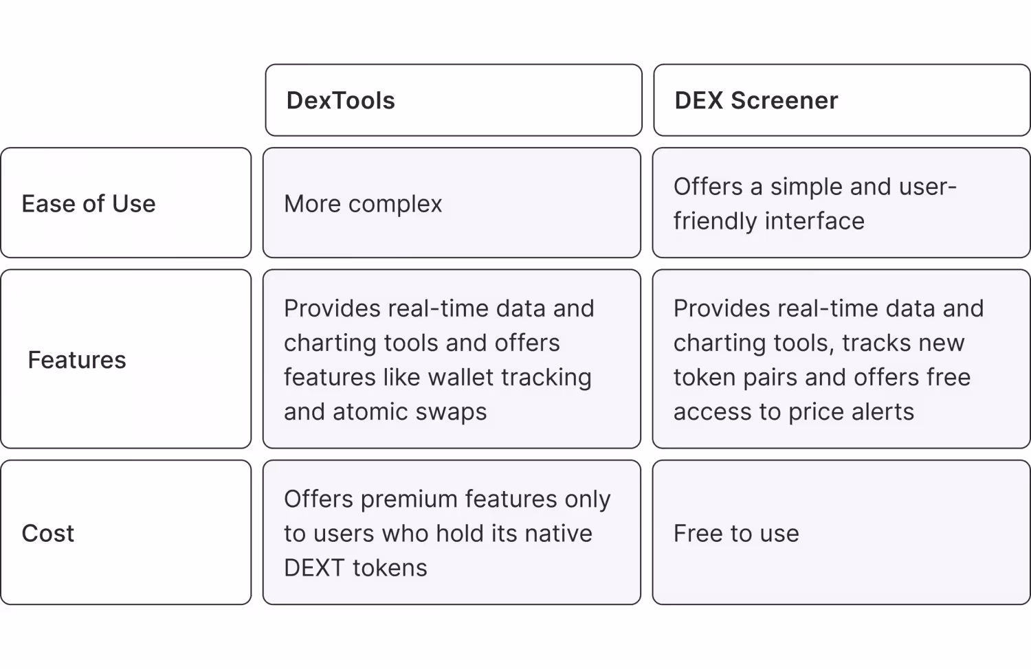 - Costo: DEX Screener es de uso completamente gratuito, mientras que DexTools ofrece algunas funciones premium solo a los usuarios que poseen sus tokens DEXT nativos.